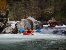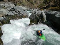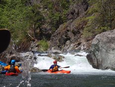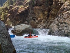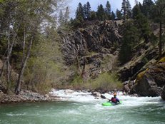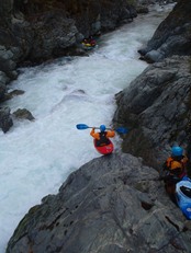 - Orion's Mom's Hole (IV). I wish I could describe this one better... because it is a serious hazard named after a friend had a close call here. In a small walled gorge, the river splits around a midriver rock and creates two channels. We went right (but left also went). It then splits again around another midriver rock. The second one, you really want to be right on. The left channel is turblulent and stuffs you into a pocked/undercut on the left wall. It is a dangergous spot, so keep an eye out for a plays where the river splits twice quickly around two midriver rocks.