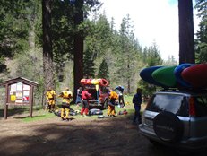 Take-out: 15 miles West on Highway 299 from Weaverville, you will cross the North Fork. Turn right on East Fork Road and travel 1.1 miles to the first bridge which crosses the North Fork. Park on the far side.