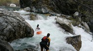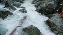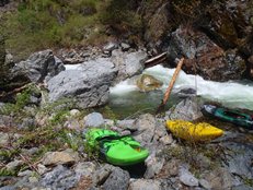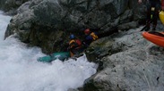 The End (V). One of the larger rapids on the run is the 2nd to last rapid. I only remember the details of the exit which was on a left bend. I tried to boof the right edge of the large drop and ended up taking a rock straight into my bum. But that was actually a welcome surprise because it looked like a mean hole... so the shallowness was in a way better than getting worked... I think. I guess moving back left across the final drop would have been idea. 1 more class III-IV rapid awaits and you will see the bridge.