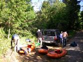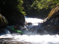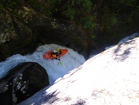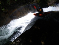 Gorge Rapid (IV to V-). In 2010, there was a log across the entry of the drop. With one person standing on the log you were able to boat up and over it with some help. The last person had to seal launch in from the right, which of course resulted in me pitoning. From there, go down the right channel, punch the meaty hole and then boof the exit on the right.