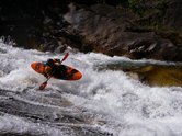 Triple Combo (V). The next hundred yards is the hardest section of river in the run. The exit of the pool below the must run, is a small hole into another very small pool. From here, drive center left and boof into the eddy on the left. This falls is about 8 feet tall. Don't go right as it is a messier falls and a messy landing. The left will autoboof you. From the eddy, ferry back out at the base of the falls (even at low water this is hard, at high water folks sometimes are forced onto dry land to portage around the second set due to not being able to enter it). The next set has a small boof over a good size hole followed by a ramp that can get a mean hole at higher flows. At this point there is a small eddy on the right for a few boats. The third part, isn't too hard, but a bit blind. The river banks off the river left rock and slams into the right wall, occasionally corkscrewing people. Therefore, you try to get up on the left rock so you fade off into the seam instead of the right wall.