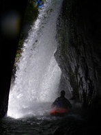 Wall Drop (IV+). After the exit drop of the slide, enter to the far left of the next mank fest. After the first little bit, it cleans up, you can eddy out left and scout the final falls, or just route it. Whatever you do, don't go down the right slide of the falls as it falls into a seam with a cave behind the falls on the right. That would be a bad place to be, rescue would be difficult. Instead, just drive left and drop the 18 or so feet to the bottom. We all tried our best to plug as the low water created a green landing zone. There is a rock shoal on the right you can set safety from below.