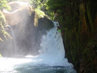 Must Run (V- to V). After a hundred yards of class II mank, you will notice a large canyon and horizon line looming downstream. Hope out on the right to scout. The line is obvious and not that hard. Just boat over the tree just under the surface, go through the pinch, and try to boof. It is intimidating but so much fun. From below you can bask in the beauty that is the Nevado Canyon. Also, portaging really is not an option, nor is a throw and go, it is a must run falls.