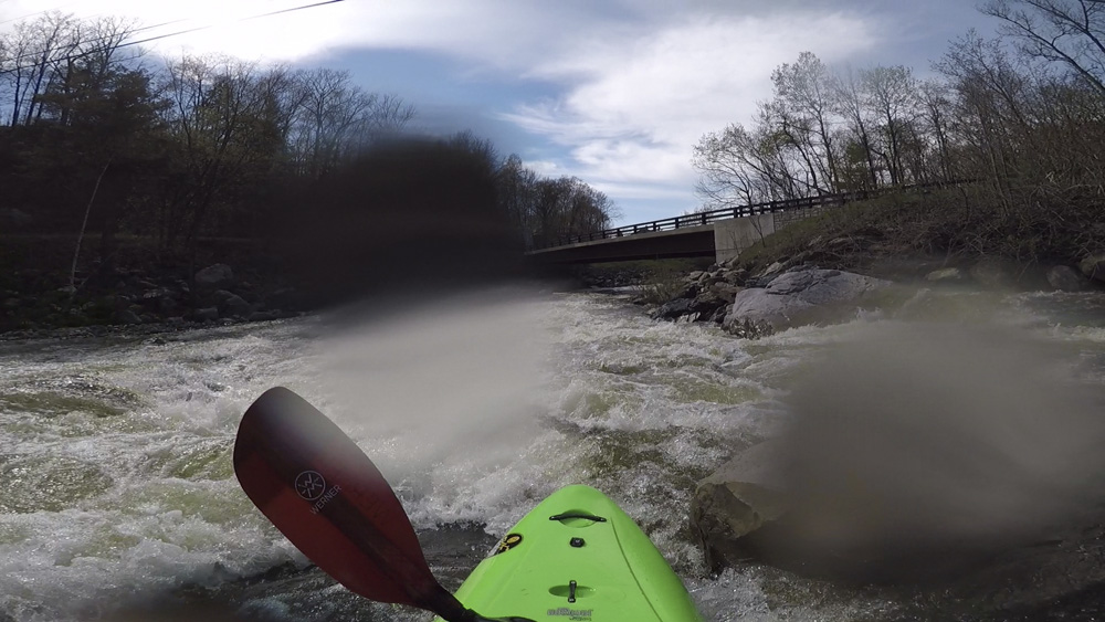 - South St. Bridge (III to IV). The biggest rapid on the run can be see just upstream of the South St Bridge in town. At our flow it was just class III, we ran a stairstep drop down the middle moving left. The holes were small. It was a little blind and horizon-line-y but don't be intimidated by that as the drop was straight forward. However, I could imagine at higher flows when the exposed rocks are underwater and form big holes behind them it is a different beast. Lower would only make it easier I figure. Scout before putting on from the bridge.