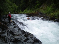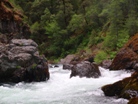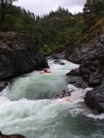 This resulted in the boat being now full of water in a fast current so after almost being drug back into the water with the boat, I had to let it go and begin to chase the boat through the 40-degree water and 45-degree air. Right here I would be saying thankfully I had a dry suit, but instead I was in thermal underwear and a dry top. So after about a third of a mile, hypothermia began to kick in. This is when I (completely exhausted and a drenaline crashing) gave up on the boat and turned just in time to see one of the sandals I had stashed in my boat float by. My partner caught up to me after a thirty-minute ordeal of his own (portaging the unknown to him hazard that had got me). This is when I began 400- foot climb out of the near vertical gorge. This gorge was made of three types of ground, loose gravel, loose boulders or poison oak. So after trying my best at the first two and setting off many landslides and a few near "Daniel Slides" I resigned to climbing up the poison oak groves on the side of the gorge.