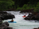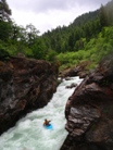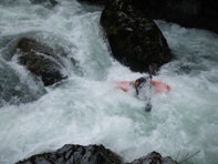 Continuing, we had a low flow that day of about 400 cfs. The day was progressing fine, we portaged the first large rapid of the gorge section due to insufficient water. We scouted numerous times due to the virgin experience. And portaged an easy entrance to a boulder garden to ensure correct placement further down rapid. All of this resulted in the day progressing slowly and our day light hours ticking away. This wasn't a concern until at the end of another long boulder garden I pitoned and immediately pinned on the same hidden rock. Without much hesitation (specially once my squirt blew) I exited the kayak and began to tug it loose. With these tugs failing, I decided to hop on the shore two feet away and tug from there; shortly thereafter I dislodged the completely submerged boat.