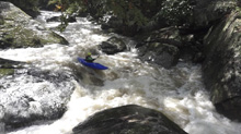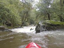 - Ender Falls (III to IV). The next section is steeper than the Essess, but also easier. At our flow, I would still say it was it was certainly class IV though. We entered left and cut far right below and entrance hole. There was an eddy on the right wall that we used to boat scout the exit ledge. The exit ledge is maybe 4-5 feet tall and was just a nice delayed boof. I can see this drop giving folks trouble though as it was sticky at 780 cfs though with a good stroke you can stay on the surface no problem.