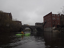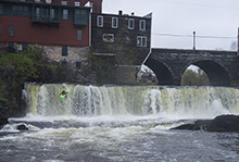 Take-out: Right in the middle of Middlebury. Main St crosses over the river and the falls 50 feet above the falls. Heading south on Main St, cross the river and take your first right onto Mill St. This rd drops steeply for 100 yards to a parking area on the left, "Mill Street Parking."