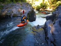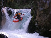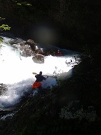 The Lower Palguin is probably the least run section of the Palguin (or at least so it seems to me). The character is not one of waterfalls, but rather of rapids with only two small drops that could be characterized as waterfalls. The runs starts off with class II boogie leading to the first ledge at which you want to be far left to avoid a cave. More boogie leads down to the most serious rapid (portage not included) on the run. A tricky lead in feeds a hole which flushes into a narrow corridor with undercuts on either side. I found out the hard way that it isn't fun to flip at the top and get stuffed in one of these undercuts. At the end of the corridor there is a small ledge hole with a good size hole awaiting. Slack water then bends around the corner and a 8 foot falls with large hole awaits you. Downstream two small rapids lead to a rapid that is no longer run out of respect for Brennan Guth who was swept into the cave downstream in 2001 and passed away (Account of the Accident). Below that one more slide to kicker awaits before the final class II boogie leads to the take-out bridge.