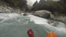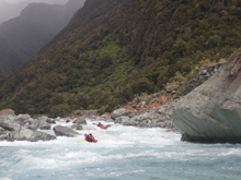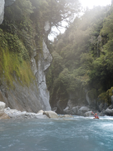 I am going to start with the same paragraph from the upstream Scone Hutt write-up. I am sure I will catch a world of grief for breaking this into two runs, so I am going to start with my rational for it. I was very surprised on my trip, how many people make New Zealand a class IV destination. I always pictured it in my head as a solid class V destination and because of that was afraid to come here for years (due to the sieves of course). But little did I know that the class IV is not only plentiful but also quality. And on the Perth, we had half of our group as only class IV boaters who flew into the lower put-in and got to enjoy a few hours of classic paddling as well as the prettiest of the gorges on the Perth. So, rather than leaving these options as a footnote in the guidebook, I wanted to bring more attention to it, so that more people can enjoy these runs. OK, so with that out of the way... So, after paddling down from the Scone Hutt section we were relieved to see our friends on the shore downstream a few more rapids. The endless scouting that we had experienced was hopefully going to end! Once at the top of the island that marks the Five Fingers drop-off (actually a kilometer downriver of Five Fingers Creeks) the boating was quite fun and cruisy. There were some boulder gardens that I am sure change yearly, and were in the class IV range. After a few of these though, the river mellowed to be class II to III down into the valley. We camped at the end of the valley at Nolan's Hut after maybe 30-45 minutes of paddling on this section. The Hut is a smaller one and only has beds for 4 people, we planned ahead though and brought tents in with us. The hut system in New Zealand is pretty awesome. The helicopters will drop your gear at them so you don't have to kayak a loaded boat for the first day, and there are typically things like propane tanks there, also usually an ax to accompany the fire place. Not bad on a cold day and at this point some 5 hours spent paddling, that is for sure! The next day we quickly got to the final gorge, which was the most spectacular from Scone Hut down. It was schist walls with super fun class III to IV rapids between the walls. Portaging is possible, though not always easy. The friends of ours that flew in just for this lower section scouted several of the rapids as they tended to be multi-move and not without consequence. There is one single-move rapid near the end of the gorge that is flow dependent which is an obvious horizon line, scout on the left. Downstream, the gorge walls open and fun rapids continue for a short ways before you bend left and drop into the Whataroa and begin your mellow float back out to your cars. I really wanted to break this run apart from the upstream counterparts because of how worthwhile I think it is, and how attainable it is for so many boaters. There is nothing more than class IV in there, and plenty of class III. If you scout a few rapids I think you would get close to 3 hours of boating for your helicopter dollars. Certainly more than flying into the lower Hokitika. And because of that, I would highly recommend this run if you want an adventure but not to bite off the whole Perth.