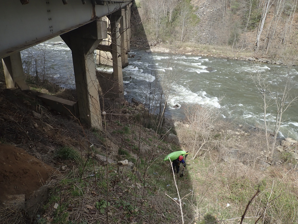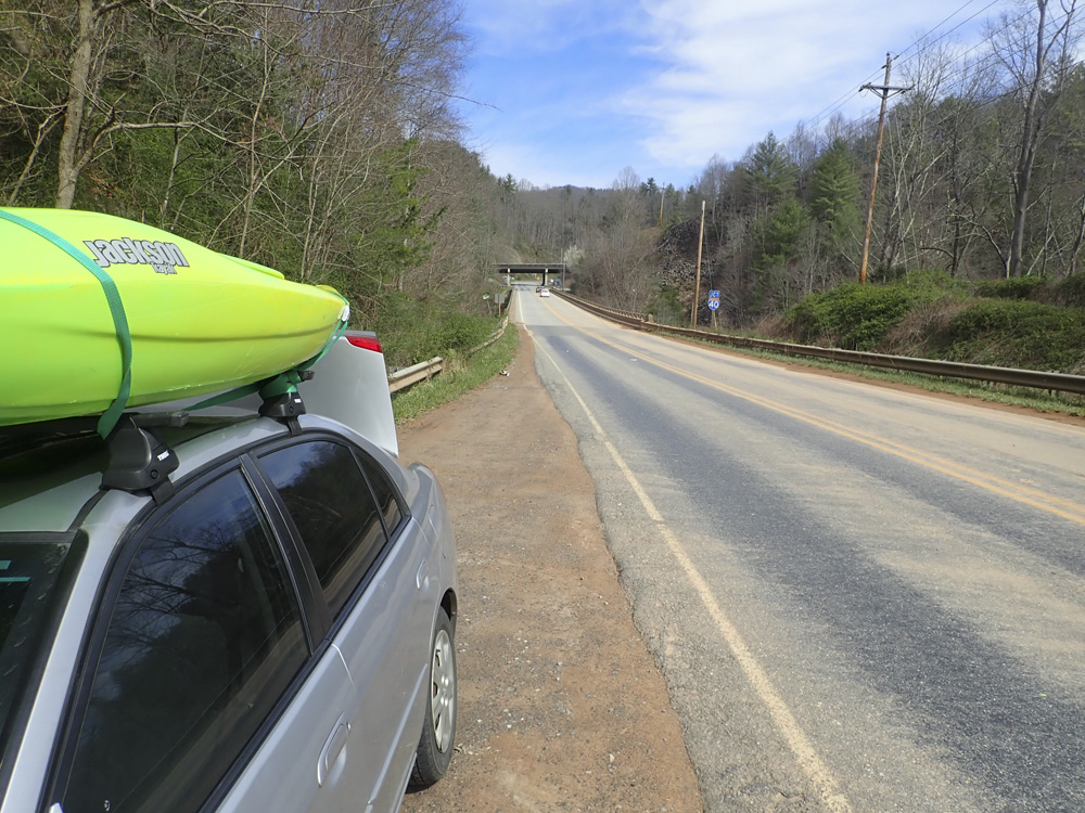 Take-out: From Hartford TN, take US-40 East towards Asheville. Follow this for 19 miles, through the gorge, and along Waterville Lake. Just past the rest areas, take exit 15 for Fines Creek Rd. Turn right, cross the river and park on the shoulder on the right. We walked up the drainage ditch under the bridge, which was steep but doable.