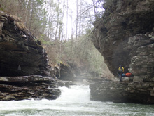 The day starts off quickly, no paddle in on this one. Around the first corner you get the first bedrock slide which drops off a powerful small ledge at the bottom, scouting is easy from the left, as is safety and portaging. Around the next corner, to the right, you get to the biggest rapid of the run. Locals have called this rapid Time Warp for years. Steve Scarborough, who lives near the confluence with Whites Creek relayed to me that the timezone change runs through this rapid. So, there is occasionally the funny outcome where you clobber the right wall, which then sends you left, where an hour later, you hit the left wall. Apparently sometime subsequent to that naming, people started calling it by "Baby Gorilla" or "Chimp." Really I am not sure why, it is nothing like Gorilla. Anyways, scout left and seal launch into the pool below if you aren't feeling threading the needle through the entrance drop to avoid getting stuffed hard into the left undercut.