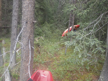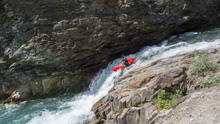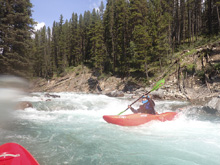 Put-in: From the shopping center, head away from the Bow River, up AB-1A to Lake Louise Ski Resort. As you enter the resort, stay low/left and drive all the way to the back of the parking area. About 100 yards from the back, there is a door in the electrified gate, this access the trail. The trail took about 20 minutes to walk. Follow it until you round a knob to the right, after this a very obvious trail will drop down to the left. This drops steeply to the river, there was a set rope there to help on the slippery slope.