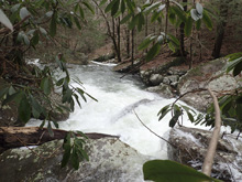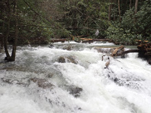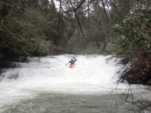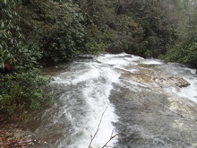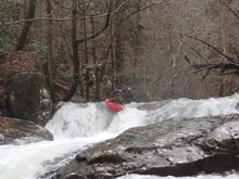 Hot Pocket (IV to IV+). Downstream is the biggest in the bedrock section. This one should be scouted on the left, all the way to the base of the falls at the bottom as it occasionally collects wood. The top is a small s-turning slide, you then want to drive right of center for the middle tier which is a steeper slide. The water wants to go left, but that has overhanging Rhodo. This leads to the final tier which is maybe 12-15 feet tall, non-vertical drop that should be run somewhere left... far left is ok, left of center is ok, mainly just have left angle. The right shore is a bit undercut.