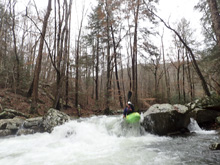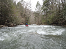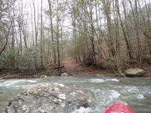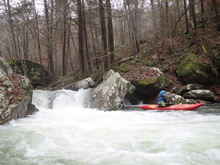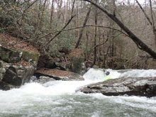 For the record, we had something like 0.6 or 0.7' on the gauge. I felt this was a bit lower than I would have preferred for the bedrock, but was fine for the boulder gardens. I have seen video down to 0.3, dang that must have been low. And I know folks run it at 1.5'... which would be sweet for the bedrock but scary for the boulder gardens. And finally, we had ~2 inches of rain within the 24 hours preceding the trip. My parting thought... going in I had heard that this is one of the best creeks in Tennessee. Kirk has it rated 5-stars. I think that it was good, perhaps with a more ideal flow it would be 5-stars. But, the effort is high. Scouting and portaging in rhoto sucks. If you knew it was clean and could bomb away I think it would be awesome, but it is so seldomly run that you can't do that. So yea. I liked it, but not 5 stars worth. Also, I think at our flow I agree more with AW's rating but can see how Kirk's rating of V could be present at higher flows too.