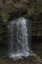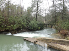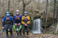 If you choose to not do the hike out, you continue on and 100 yards later most (or ALL in our case) of the water disappears. We got out and started walking. 100 yards later we saw a cool waterfall where the water exited a crack in the rock, fell 20 feet, and went back under the rocks. We walked for under a half mile on the 4x4 trail to where 50% of the water came back out via a crack in the right wall. This enabled us to float a half mile through an acceptably paddleable forest to where the Little Sequatchie joined on the right. From there, the river was clear and class II rapids took us quickly down to take out.