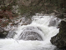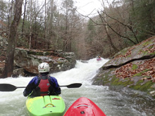 Small Boof (III+). After a small low angle slide, the river bends left around a corner and goes off a small ledge. It is two tiered with the top being a small slide, run it aiming at the left rock. Then shift right a little for the ledge.