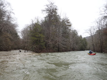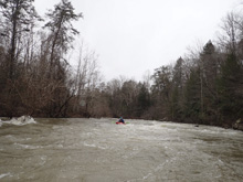 Boogie (III). The exit is mellow enough, but the left channel was full of wood, so we boofed down the right and then looped out and back to stay far right.