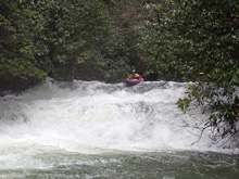 Lower Pocket Pussy (IV+). One of the better drops on the boulder garden section. A nice entrance boof can be run any number of places. The exit is through a tight slot that exits over a 7 foot ledge or so. Try to get a good stroke. This and the rapid above are apparently called Pocket Pussy because if you sometimes get squirted out. (I am sorry, I did not name this, nor create that meaning... and boy boaters wonder why girl boaters complain about the sexist underlying nature of the sport. The next write-up I have on my list, South Sauty, has a rapid called "Tits" as well... so yea, I get it. Sorry women).