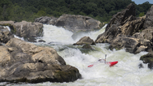- Horseshoe (IV+ to V). This rapid too has varying lines for different flows. At the higher flows (what we ran) you want to boof the far left rock, just off the right side of the tip. The landing however is shallow so this should be avoided as flows drop. As flows drop, head to the far right bank of the channel and ride the wall down and around the hole. This line was just dropping in so two out there the weekend we were there ran it. The place to avoid at all but the lowest flows is the center, a big horseshoe hole that has the power to change your life... and not in a good way