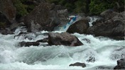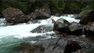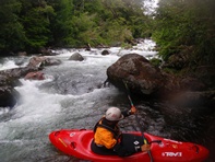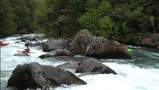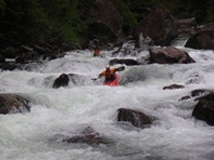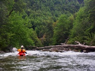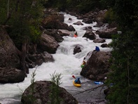 Third Section (IV+ to V-). This section was long and exposed. The river split around a house sized rock. You want to be on the left side. Then, behind the rocks, move right. Now there are apartment sized rocks splitting the river. Take the channel to the right over a steep rocky drop. The run out has two good size holes, both are run down the left. This section I can imagine becomes stout at high flows. At the low flows, the hydraulics all flushed. This is the end of the hard section of whitewater.