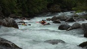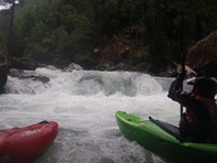 Finally, I have been told that the scenery is very pretty on the Puesco. Our day however, was the one rainy day of our trip. Thus, we could see the bases of tall canyon walls, but could not see how far nor how high they went. Still, it was very nice. One final note, this run is as road side as can be without being able to see the road. So if at any point you decide it is not for you (one in our group came to this conclusion), you can hike off to the road above. Oh, and one more note... The run is really short, I would plan on doing two laps (that will still go very fast) or continue down river another 2.5 miles to extend the run. We were hoping to get back to run this lower section on a more energetic day but ran out of time. I was told that instead of being continuous class IV, it has more distinct rapids that are closer to class V with easier continuous water in-between. This run is really impossible to do a mile by mile for. It is absolutely continuous with only one or two short, fast moving lulls in the section. However, there did seem to be a couple of distinct sections.