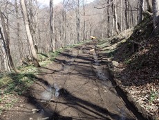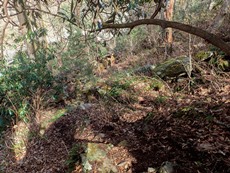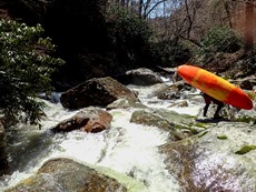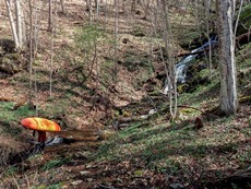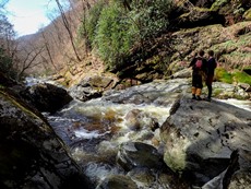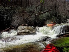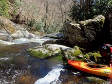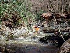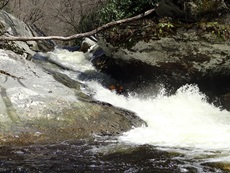 Put-in: Head back downriver for 0.4 miles on Big Cove Rd and look for Calhoun Rd, turn left and climb steeply. Drive slowly as several homes own animals that are often found on the street. After a sharp left bend the road turns one lane, continue straight. A bigger looking rd goes off to the right but this is a driveway, stay straight on the very small one lane rd. Now 100 ft later a small paved road goes off to the right, stay straight on what turns into a dirt road. Climb this steeply up to the first hard right hand bend. There is a turn out here or in 100 feet that you can park at if you did not bring your 4WD High Clearance truck. If you did, look to your left as you make the bend and spot the rough road climbing steeply. This first 100 yards is the worst of it. After that you will be on a railroad grade though it is rutted at times. Continue to the end of the road and park, this is the upper parking area. If you are parking at the lower spot... you walk the same road. From the upper parking area, take the trail upriver... there are a lot of trees down to duck or climb after so the hike goes slowly. From the lower parking expect 40-50 minutes. Hike until you can see the river less than 100 feet below you, you will come to a spot where the trail disappears in a landslide scree field. To put in at Anaconda, descend the scree field to the pool above Anaconda. If you want Lord of the Rings, cross the scree field before descending.