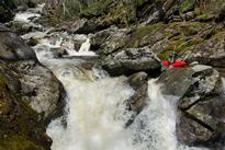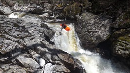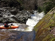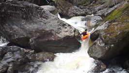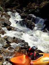 Mortal Combat (V to V+). It is starting to get steep! Eddy out on the right to scout from above and potentially portage the spout. The old entrance on river left is full of wood now and the new entrance requires enough water to soften the landing. If the water is ~10" or higher you can boof the left side of the right channel for a fun 8-10' boof. Others choose to portage on the right and put in at an eddy just below. Below the spout, the river starts sliding, start left of center. This slides into a fold and then up and over a hump... you want to be on top of (erroring left) of the big hump. Below, the river slides and hits a small hole with momentary deep water to grab to pull yourself as far right as you can get. There are two small fans of water, you want to go between the two erroring to going over the top of the right fan. This will set you up for the final slide and lands you clear you of the hole. If for some reason you get pushed far left on the final slide it finishes by landing in crack that then lands you in an undercut and bad backed up hole. Lots of swims happen by that error.