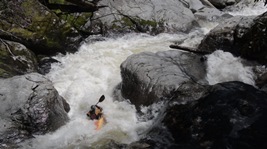Mike Tyson's Punch-out (V to V+). Put in just below Atomic Elbow Crusher after scouting from above. The line is to enter the small ledges center-ish and then work right through the pinch to hit the great shoulder boof. Too far right though lands on a shallow slab. Below, work right into the shallow slide that then leads you to the corner. Round the corner hugging the inside to stay right on the slide below. Getting too far left leads to a rib of rock to piton or flip on. Staying right also lets you keep you momentum to then drive left across the hole at the lip of the exit 15 foot falls. For the falls, you just don't want to be far right as there are nobs on the wall during the falls and the landing is a little undercut. This rapid really does boat much easier than it looks like it will!