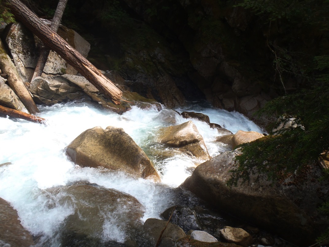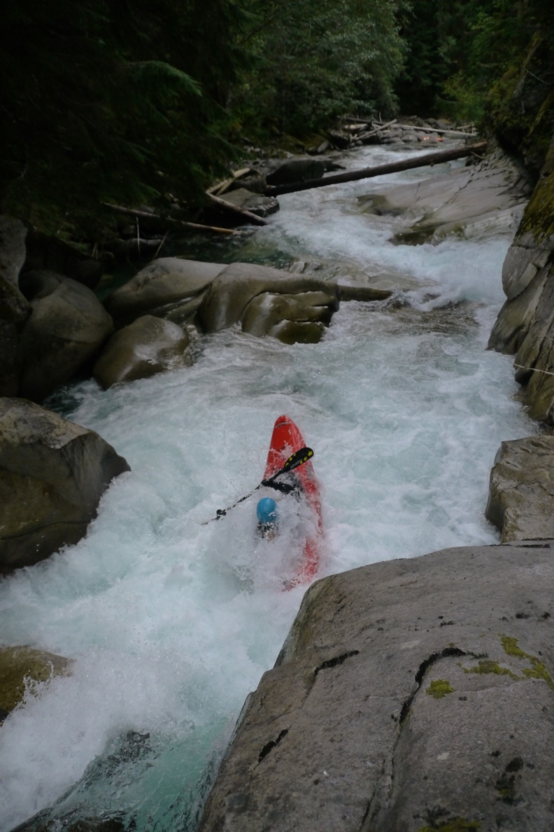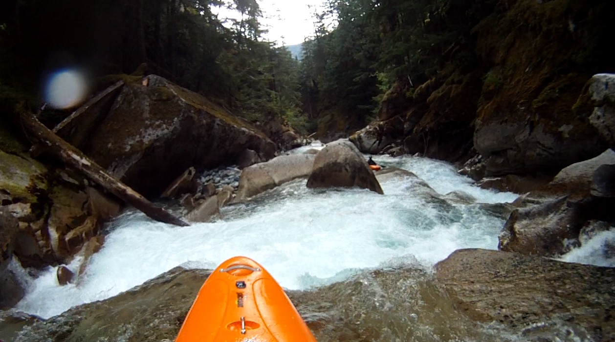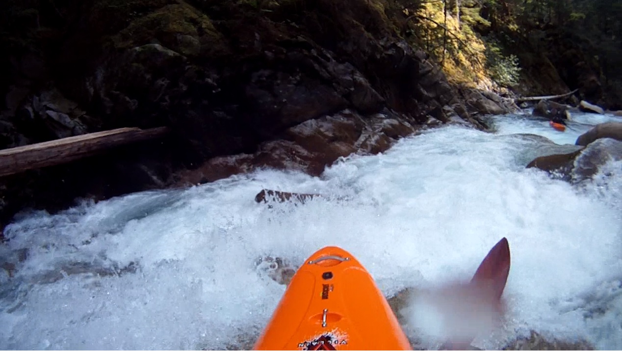 Last Good Rapid (IV+). Other than the Triple Drop, this is the most fun rapid of the run. A fun hole to try to boof (or plug through) leads to a slide and kicker that lands you in a 90 degree left turn. Run the slide pointing left. The slide then continues for the next 100 feet.