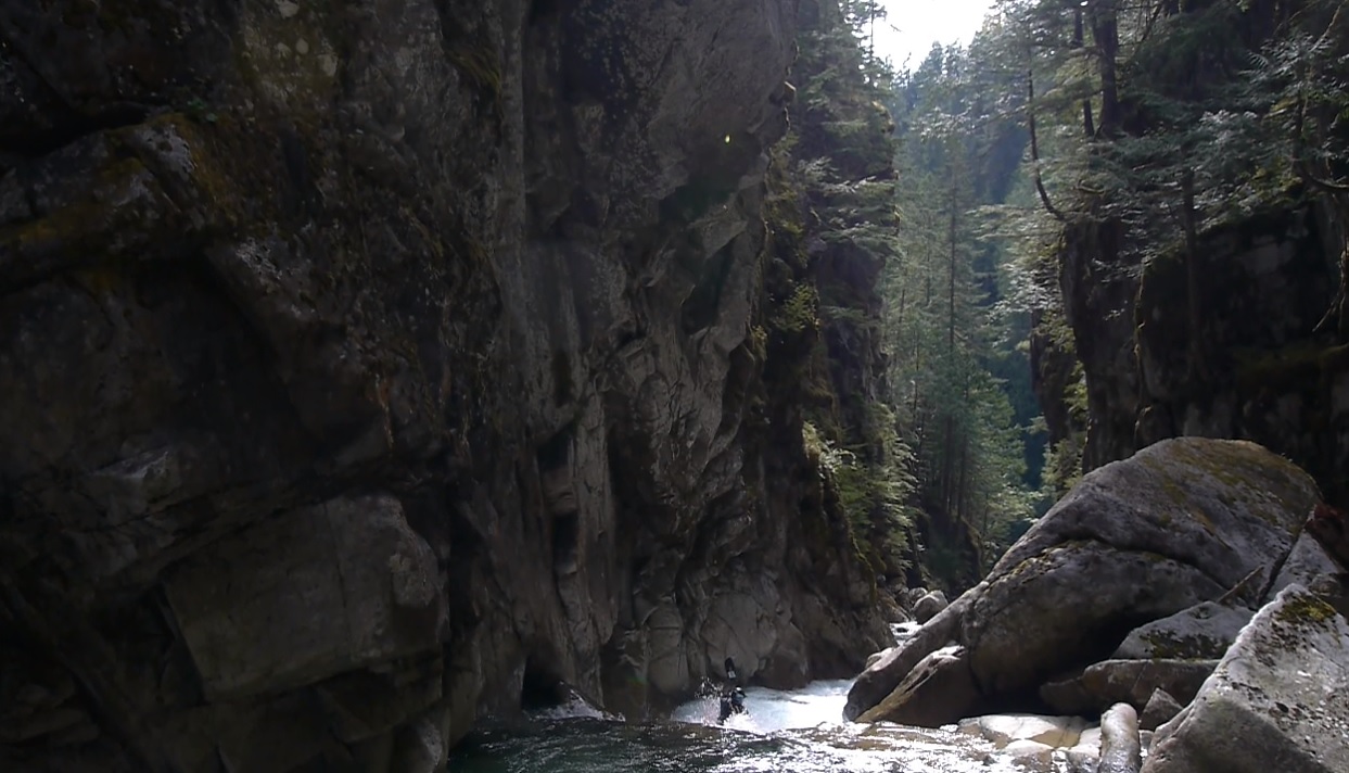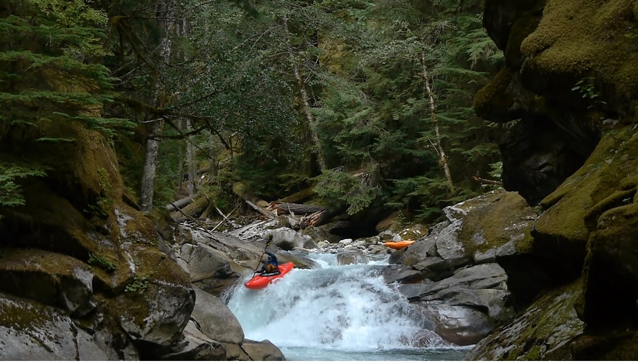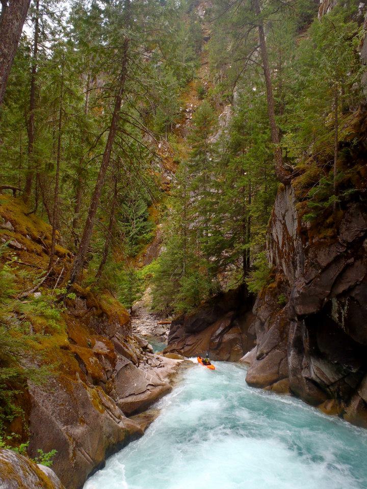 Tight Gorge (IV). A cool little ledge best run down the right is followed by a fun boof on the left. The gorge is super tight here and illustrates why you want to make sure you don't allow yourself to drift right on the hike in.