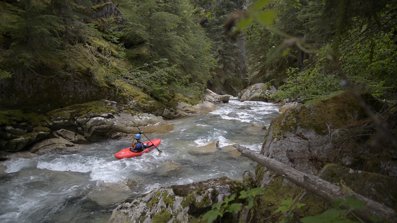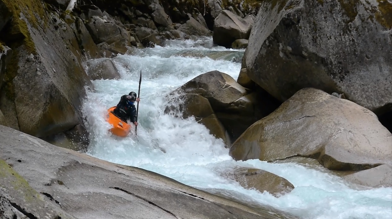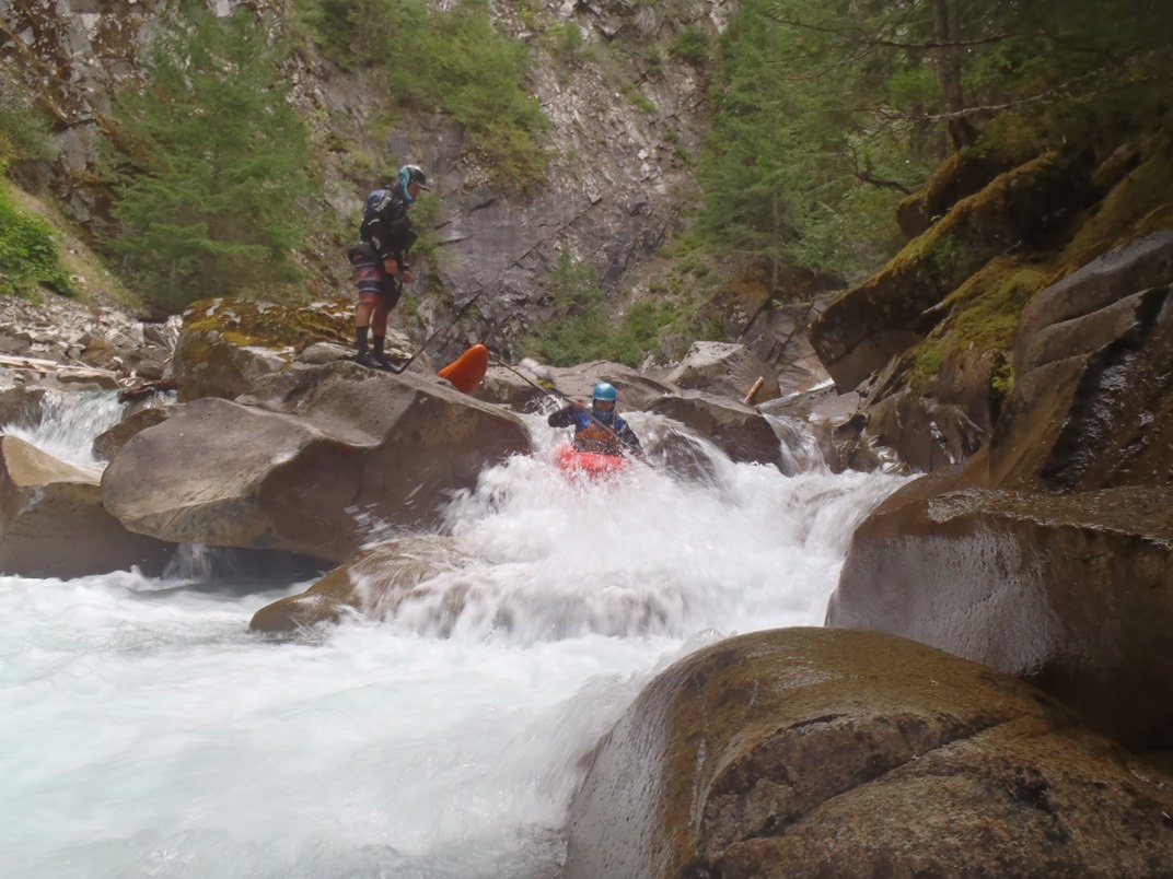 Blind Rapid (IV+). Immediately below is a rapid I hoped out on the right to scout. The middle is blind but looked good enough for Darin to drop into mid rapid eddy just above the crux for a final look to confirm. Enter center and boof center moving right. The left drops into a little bit of a sieve.
