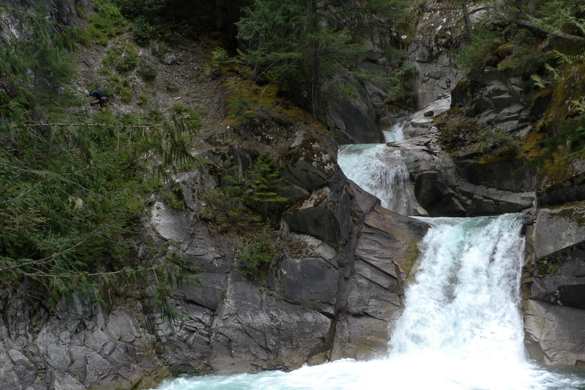 To avoid confrontation with the land owners (First Nation Indian tribe), I would suggest only taking one car and hiking back up at the end of the day. You do not want to park anywhere on the main road as cars have been burned when parked there. Another option is to boat down to the campground a km or two downriver on the Lillooet River. The option that we chose was to take-out before the bridge and hike up to the car above (it was too steep to bike up the road). The do this, look for the ridge dropping down to the river, as it levels out and merely 15 feet off river level, depart the river and head generally down and away from the river and quickly meet up with the road near its outlet to the main road. This allows you to hang out while one person hikes back up to check out the falls.