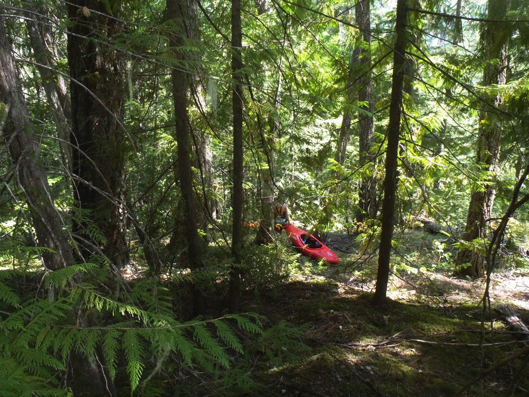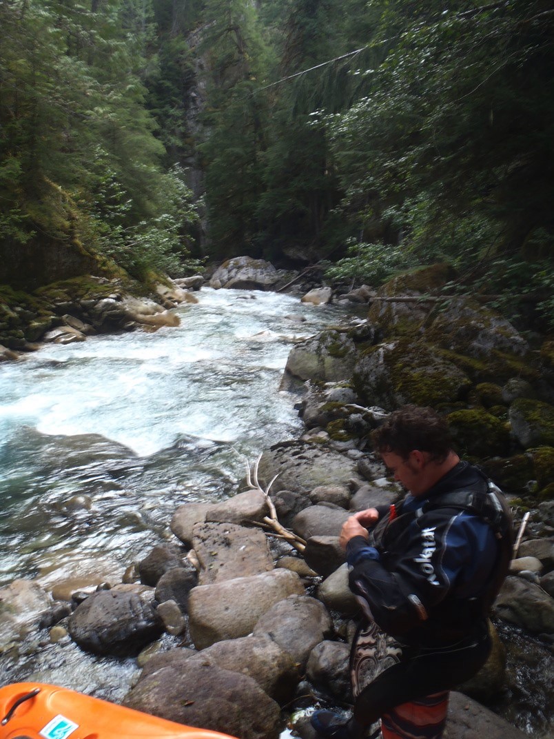 Put-in: Drive up Rogers Creek rd. At the 1 km marker, hop out the car and walk 10 feet off the road to take a peak down at the Triple Falls to check flows. Continue up the steep and dirt (not in good shape, my Highlander was just enough) road for 1.65 miles (2.7 km). You will have passed one large clear cut and reentered old growth. There is an obvious wide spot to park on the right just before you enter and even bigger clear cut. If you reach the fork in the road, you have gone too far by a hundred yards. From this turn out, start down the hill (no trail). The hill side wants to push you right, keep moving left. Eventually we came to a ridge and dropped down the left side of it straight down to the water. Ended up not being too bad at all. If you end up on the right side of the ridge... it cliffs out and you would have to backtrack.