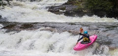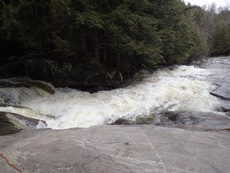- Slide (IV+). You will get to a very obvious horizon line, it is time to scout on the right. Don't be tempted to follow the main flow down the left as the bottom hole has a very large hole. The main part of the slide is a big two part s-turn, first straight and then a 90 degree turn left into a pool. You want to be right of center at the top to be able to drive far right for the bottom. The exit of the pool is a 5 foot ledge. At medium flows, you could exit anywhere with the only moderately sticky part being far right. At high flows I think you would want to exit far left where the angle of the drop is more gradual and would create less severe of a hole.