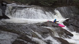The run was mostly nice. Putting in on Rocky Brook we were experienced some low water, manky, boat bashing with two nice rapids. The first of which could of used twice the water to make it cleaner as Diane reached in and found a piton. Once past the confluence we were on a full sized river and quickly came to Cannibal Falls. The pictures of the falls that I have seen are all much lower water and quickly our hopes of running it faded as we saw the extremely pushy lead in doing everything in its might to move you to the a massive piton at the right side of the base of the falls. Maybe it goes well, but having never seen video of someone running it we opted to portage. Downstream the rivers turns into boulder gardens that climax just before and after the bridge on N. Dorchester Rd. This then leads you to the big slide which is relatively easy, but very picturesque. Downstream it is all boogie to take-out.
