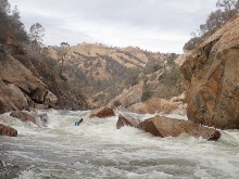 We opt to take a quick lunch break as it was now almost 2 o'clock and haven't eaten yet. There was some discussion that the one or two rapids we ran were beefier than the prior day and that water must have risen. I honestly wasn't certain... I thought maybe it was a little bit up but not a whole lot. While sliding back in his boat Darin states he thinks it has just come up a foot since we got out, I paid it no mind. Downstream we get to a rapid that was a boof with a ledge the prior day, today it was a ramp with a soft hole... no ledge. This opened my eyes but still, we didn't think it would change what was downstream much. So with that optimism in mind I paddled up to the lip and committed to San Joaquin Bluff #1 before seeing what the increased flow had done. As I do, dread settles in, I yell over my shoulder to them to scout... they all wear ear plugs and none of them heard me... so they didn't know what was a shallow slide into a relatively calm eddy was now a full water boof into a recirculating and depressed pocket. I manage to get a good boof but carry too much right momentum and end up in a hole exiting the pocket, flipped I roll up onto then get flipped face first into the right wall where I am not in a recessed pocket. The prior day I ran the line near there, so I pushed off the rock into the outflow that I hoped wouldn't get me stuck in the hole nearby. Luckily it worked and I rolled up in time to see Darin have a sweet line through the bottom. Then Haven came through with a nice line through the top only to get stuck in the bottom hole in the middle, she battled and somehow made it out still in her boat... I think I would have swum! Next Shannamar came through and didn't get a good enough boof through the top, landing in the pocket and getting firmly stuck. Quickly I saw some ends getting through and a battle ensuing. It is actually one of the more worrisome situations I have seen. I could tell it had potential to hold her, I quickly exit the river. I am on the wrong side of the river but I am hoping I can work up to parallel to it and hit the 70 foot throw. I knew that ferrying over to the other side may not work as it was a very hard ferry to make and that even once over there climbing up the house sized boulders would take at least 5 minutes, all of that would be too late so best bet was to work up the size I was on. Close to a minute later I saw her still recirculating, now out of her boat. I jump a few more rocks... then to my great relief I see her float out, exhausted but alright. Darin and Haven managed to get her boat and paddle to shore at the lip of #2. The boat was pushed out of the main current and it pinned itself in the small side channel. Easy to access we quickly pull it out. Everyone is shaken up and pretty much over it as now we realize the flow is so high. We portage the entry move of #2 and seal launch in backwards below to then immediately ferry across to the left channel for the exit which we are all relieved to see is washed out compared to the lower flow. Downstream we make quick progress to take-out where we are grateful that the mini-epic didn't go any worse. We hike out to find Jeff sitting in a chair drinking a beer, having beaten us by a good bit. We share the news with him that the water rose and that almost certainly that is why his boat floated away.