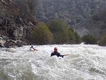 Putting on the river starts with some fun class III to III+ rapids. This then turns to long periods of flat water with an occasional rapid. I think at this point we were still on the 3,000 cfs rather than the 2,000 cfs that was just ahead of us. A few spicier rapids in the class III+ to IV range then opened up to mostly flat water with just an occasional rapid. Though those occasional rapids felt class IV due to the size of the hydraulics we were avoiding. All would have felt perfectly in place on the Lower Tuolumne. /the river makes a huge bend turning North West, South, then East... as it then bends back down to the South you finally reach the crux section. I hope you aren't tired from the flat water paddling as you will need your energy!