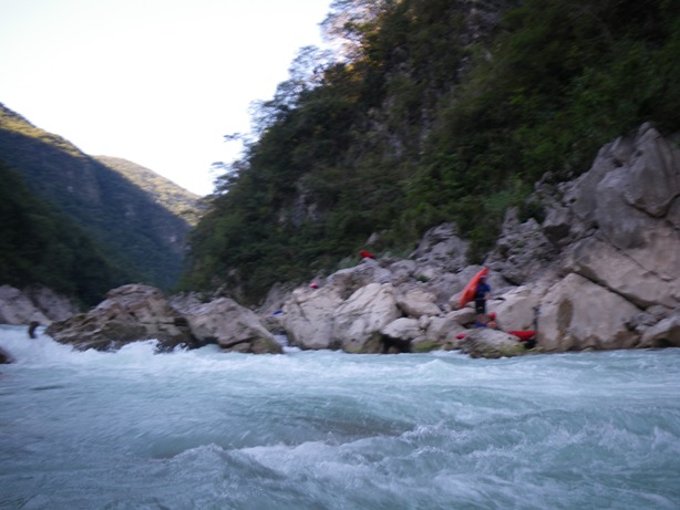 Gavilan (IV). A short S-turn that was blind until you entered. You want to end up right. there is a pocket eddy eating everything that enters to far right. Backed up by a rock creating a large cushion in the middle. Ride the cushion up and around the eddy. One in our group went left and it looked ok, but I am sure there was a reason why the beta said to avoid that side.