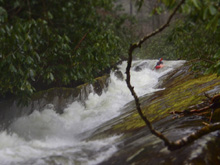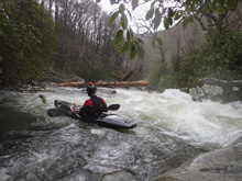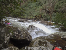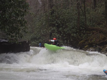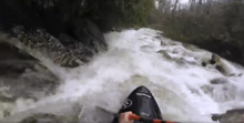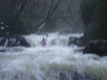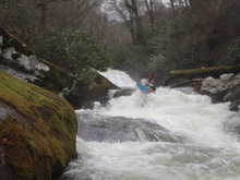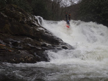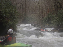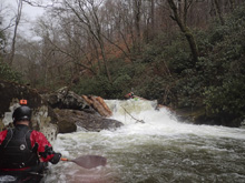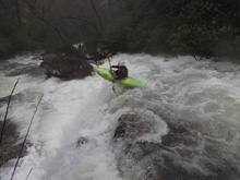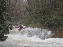 Double Drop (V). Not more than one small move downstream is one of the better rapids on the run. This rapid was best run center driving left onto the middle of a steep slide that dropped back to the right. Hit the bottom straight as it is caldron. Then turn left and boof the exit ledge anywhere.