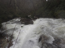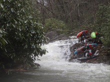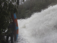 Ten Footer (V). This drop just didn't look appealing. A super broken ledge standing 10 feet tall or so and a shelf extending out on the left implying the landing is shallow. Additionally, the far right goes into a no go slot. Immediately downstream is a sticky hole that was ok if you were straight and in control. All but Jim chose to walk on the left. Jim didn't hit bottom but it didn't look pretty. He has apparently also run this drop at low flow. Others said they have never run it.