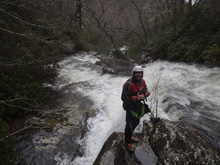 Heading downriver, the river turned to boulder gardens. Surprisingly, as the river got bigger, the eddies got less frequent. Some drops were classic, while others were long hole/boulder dodging affairs. Trees were always present and in some cases portaged, others were delicately avoided. But we began to fatigue and mistakes began to get made. To add to it, we were beginning to run out of daylight. We realized that the chances of finishing were unlikely. Then, near disaster struck.