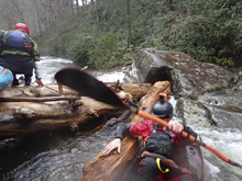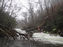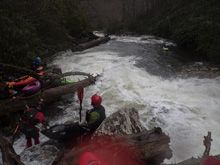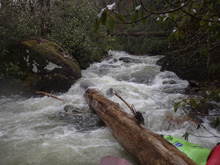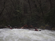 Crack (V-). Just downstream, we ran into a tree that was blocking 99% of the river. It turns out though with an exposed ferry, you could ferry in front of the tree to the 1% opening. Some beta was not passed though and a few of us didn't know about the undercut left wall below. I was 80% of the way upside down against the wall as I dropped through the 4-5 foot tall crack into a big hole. Luckily I rolled up immediately as 1) the hole was big and 2) just below was a junky exit ramp. It turns out the other group out that day had a swim here.