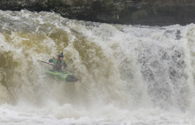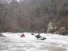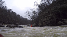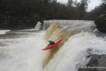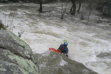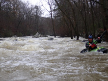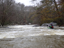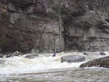 Tornado (III to IV). Immediately below Grotto, was this which I view as the exit to the sequence. The water runs down right to left on the left side of the river. Matt boofed the flake that formed the right edge of the channel and had a nice line. I got too much rock and was popped up rather than out, landing flat at the base of the drop and initiating a back ender. Diane saw me and tried to just boof the hole without the rock, and also got back endered. Luckily, the hole was friendly and we both rolled up downstream of the hole.