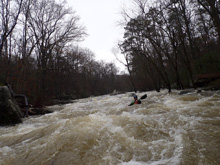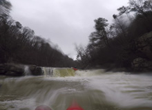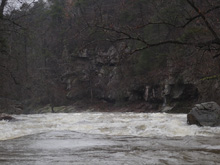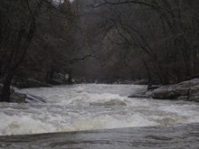 - Grotto (IV- to IV). At really low flows people run down the far left which is basically the only channel. At our flow we ran the left shoulder of the midstream "island" of bedrock which formed a 6 or 7 foot tall ledge. I know at lower flows, people are able to get out on this island for scouting or pictures, at our flow this wasn't possible. Once we ran the entrance, the only way down was down. No scouting. So, if you want to scout and the water is medium or higher, get out early on the left.