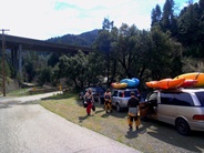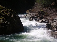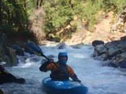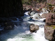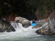 Slate Creek is a little tributary to the Sacramento River just above the inundation that is Lake Shasta. The creek tends to only get run after a recent rain when the Sacramento River is reading over 3,000 cfs at the Delta. However, we got a little luck and got a early warm spell with 170% after snow pack which brought the Sacramento up to 5,500 cfs and Slate Creek up to the runnable level. However, just because the Sacramento is at these levels certainly does not mean the creek will be runnable, the only way to know for sure is to go to take-out and peak at the painted gauge. Now here too lies a difficulty. We had ~9" on our first lap and 11" on our second. Both good medium to low flows. However, approximately one third of the river is diverted just above put-in and is returned just before take-out, thus the gauge represents more water than the good section of rapids will actually have. Why do I mention this to you? Because the diversion is not always on, thus 11" on the gauge can also be a juicy (aka healthy, aka very splashy) flow. If the rapids at put-in look a little low, manky, but doable, than it is probably a good flow for your first time down. Even at lower flows, the rapids are very continuous and eddies small. At high flows I have heard you just hang on for the ride and don't stop until you are below Black Jack Falls. So buyer beware. Apparently people usually draw the low water cut off at 6" on the gauge but I have also heard of really low water runs down to 3"... though I cannot imagine how much their boat disliked them at the end of that day...
