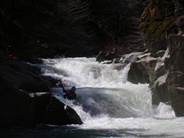 Roulette (IV+ to V). When the river turns left, eddy out on the right before entering the class II lead in to scout. Drive right and get on the rock shelf to boof around the first hole (several of us got rejected by the cushion and melted in, it worked out ok for the most part. At higher flows I would not bet on that). The exit drop is another sticky hole, also best run on the right. The portage is also easy on the right and is commonly used.