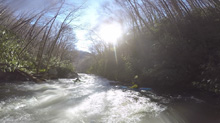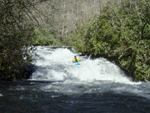 - Upper Falls (IV to IV+). You come around a bend, the river widens, the bed turns to bed rock, trees clear and the sun hits you. You are above this falls. Have one person look from the last minute eddy on the right to check for wood. Everyone, just route down the middle for this long and super fun slide.