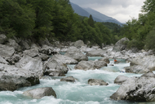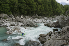 Put-in: Continue up the main road to the town of Trnovo ob Soci. Take the turn towards the river on the western most side of town. Just past the first row of houses turn right and follow past the houses to the first larger left turn. This leads quickly to another parking area which is take-out