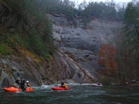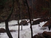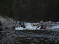 Once on the water, you get a junky boulder garden which is very reminiscent of the rapids downriver. If the put-in rapid treats you badly, I would walk off. Downriver awaits many more rapids just as big if not bigger. Below the put-in rapid is a great boof which then boogies quickly down to the main event, Oceana. What a fun drop... possibly the biggest, most intimidating class IV rapid I have ever seen... of course, with 700 cfs it was more of a class IV+ thanks to the hole at the bottom and a much larger "Thing." Downriver, the drops keep coming, a few have huge holes that are easily avoided while others have multiple move boulder gardens or bedrocks ledges and slides that will keep you smiling through the remainder of the run. When possible, try to remind yourself to look up and around as the scenery is quick spectacular too. Tall cliff faces surround you amidst the densely packed forest. And it probably goes without saying, but those cliffs also lock you into the canyon... the only way out is on the water, no hiking out or egressing back up river.